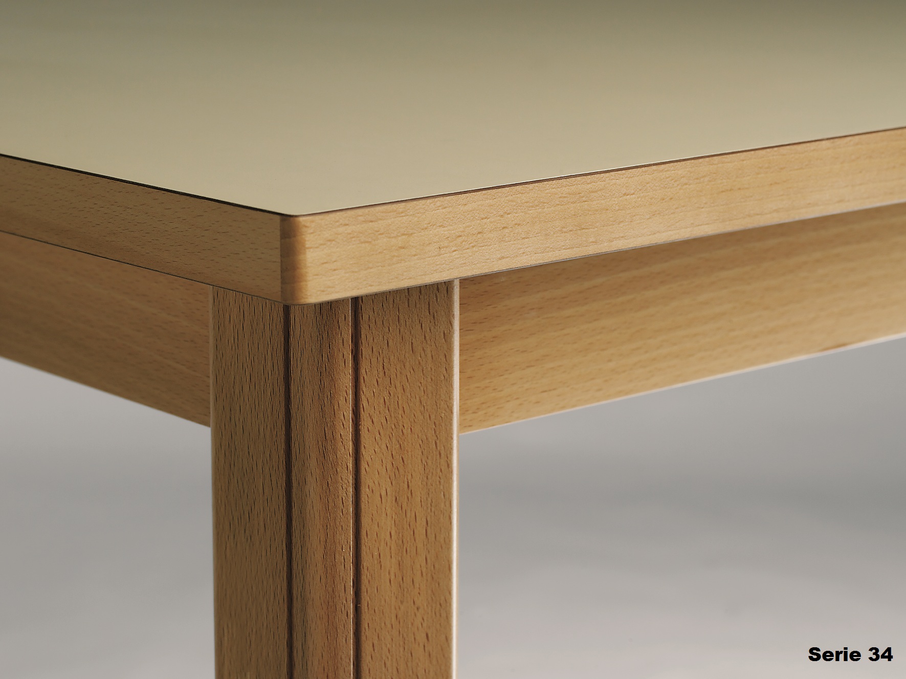 Tapa fabricada en aglomerado de 25 mm de espesor, cubierto estratificado, color a elegir según tabla adjunta. Contorno de madera de haya maciza barnizada de 35 x 25 mm.