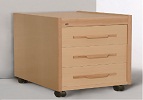 Fabricada en aglomerado de 23 mm de espesor, barnizada en su color con fondo poliuretano pulimentado, terminación en lacas semimates. Frente y costados de haya maciza de 23 x 7 mm. Tapa con frente macizo de haya de 63 x 15 mm, para alojar la cerradura de los cajones sujetos al costado con correderas deslizantes.