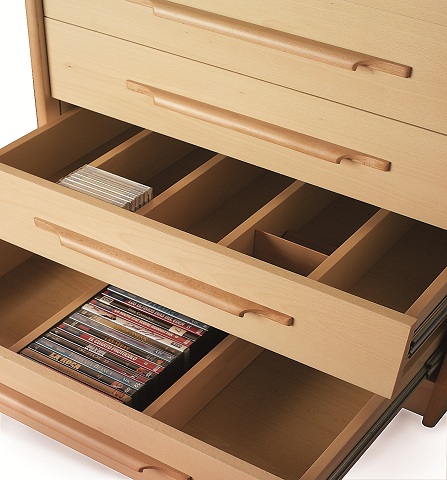 Cajones: formadoo por cinco cajones de 772 x 180 mm los frentes, fabricados en aglomerado de haya de 19 mm, los frentes, y de 16 mm el cajón. Con cinco divisiones por cajón.