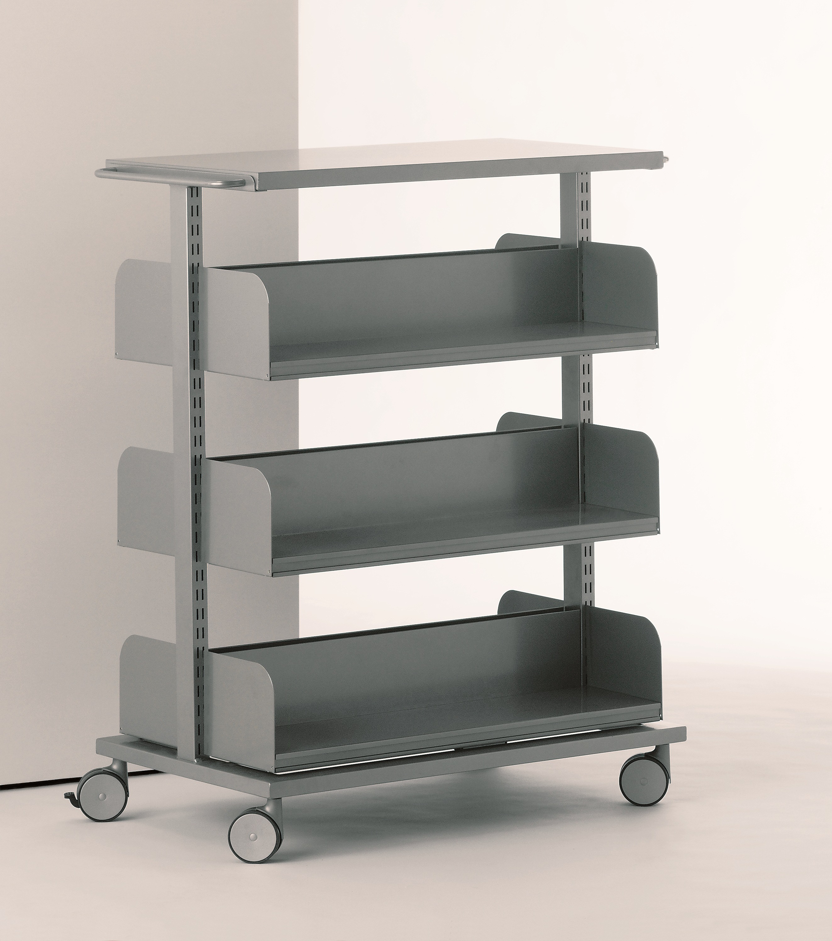 Estantes de una sola pieza en chapa de acero de primera calidad de 1 mm de espesor. Incorpora portaetiquetas y retenedor trasero para facilitar la sujeción de los libros transportados. Sujetos al bastidor mediante las cartelas de sujeción. Acabado en pintura epoxi.