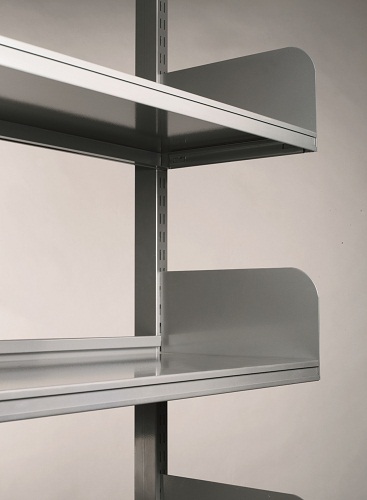 Estantes de una sola pieza de acero de 1ª calidad de 1 mm de espesor. Incorpora portaetiquetas y pestaña sujetalibros tanto por arriba como por abajo. Sujetos a los pies mediante cartelas metálicas.