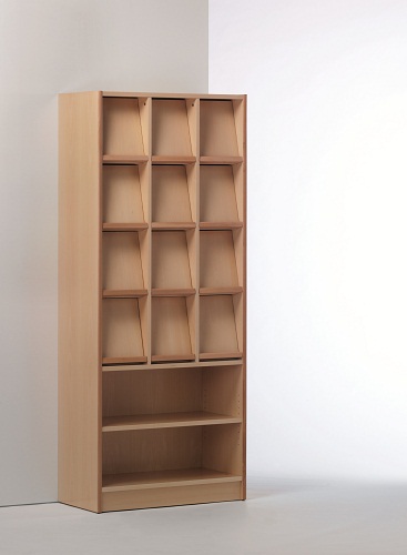 Lados: fabricados em aglomerado de 23 mm de es­pessura, chapeado com folha de faia de primeira qualidade em ambos os lados, com orifícios cada 32 mm para fixar as prateleiras, perfis de canto redondo em madeira maciça de 23 x 7 mm.
